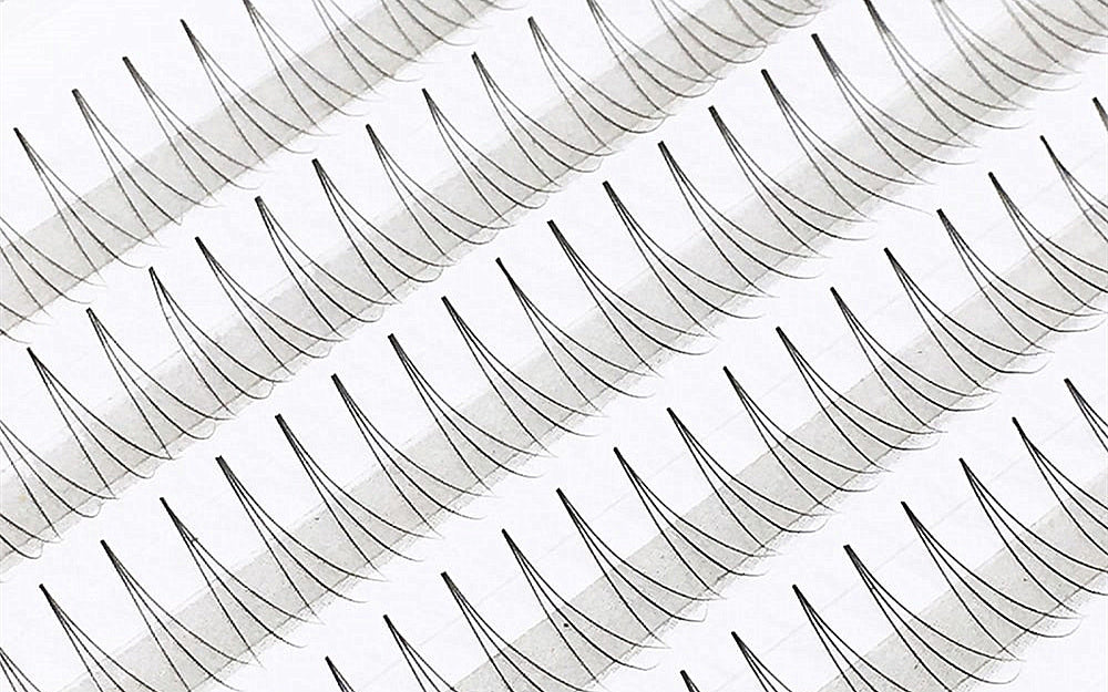 The finished fans are then neatly attached to a strip of adhesive with rows of other premade lash fans, and they are shipped out on a tray.